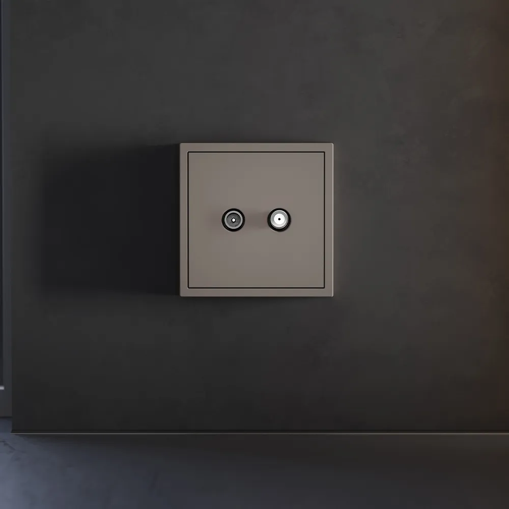 Белые глянцевые рамки + механизмы антрацит, графит или чёрный матовый. Глубокий контраст добавляет интерьеру характера без агрессии. Особенно эффектно смотрится в минимализме и лофте.