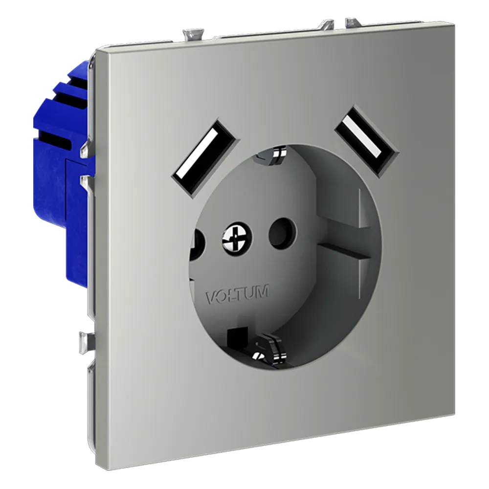 Розетка встраиваемая VOLTUM S70 с заземлением и защитными шторками 16А с USB A+A (сталь)
