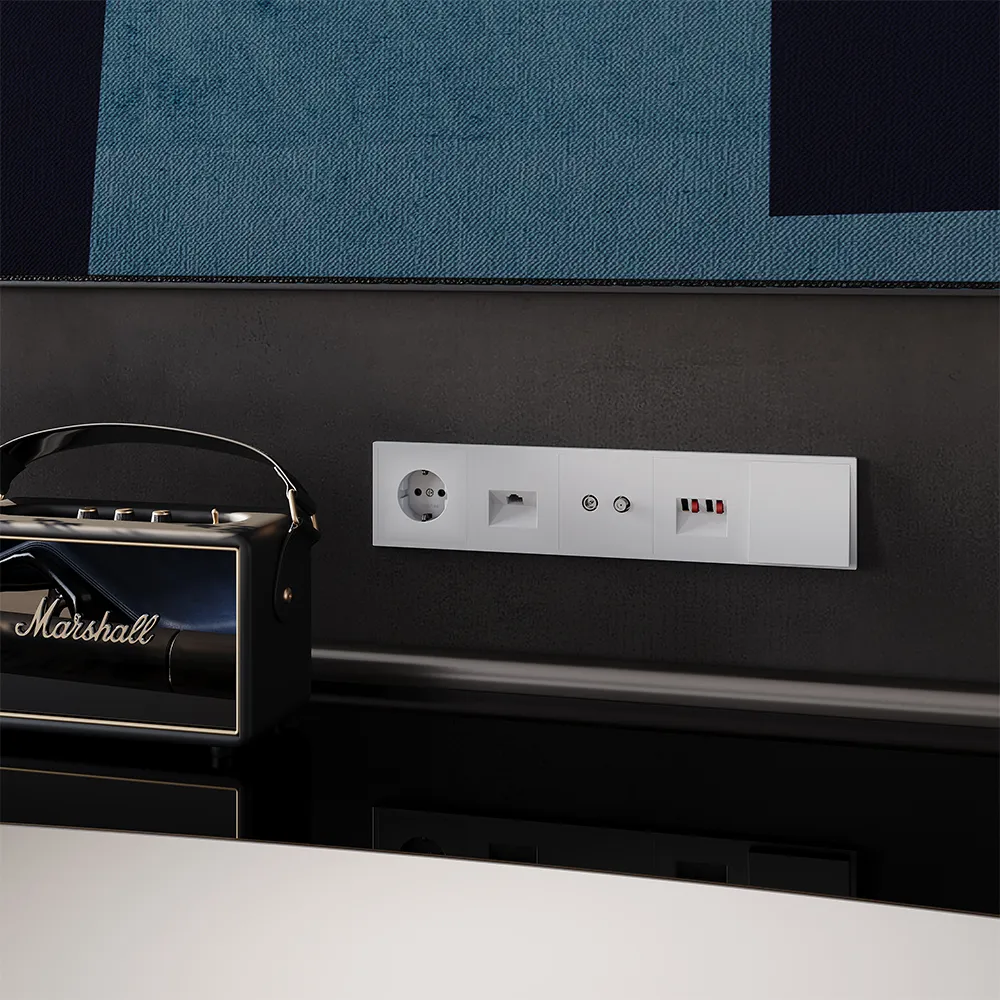 Вывод кабеля легко интегрируется в любую композицию на стене — рядом с розетками, выключателями или мультимедийными устройствами, создавая цельную, продуманную и чистую электрическую инфраструктуру.